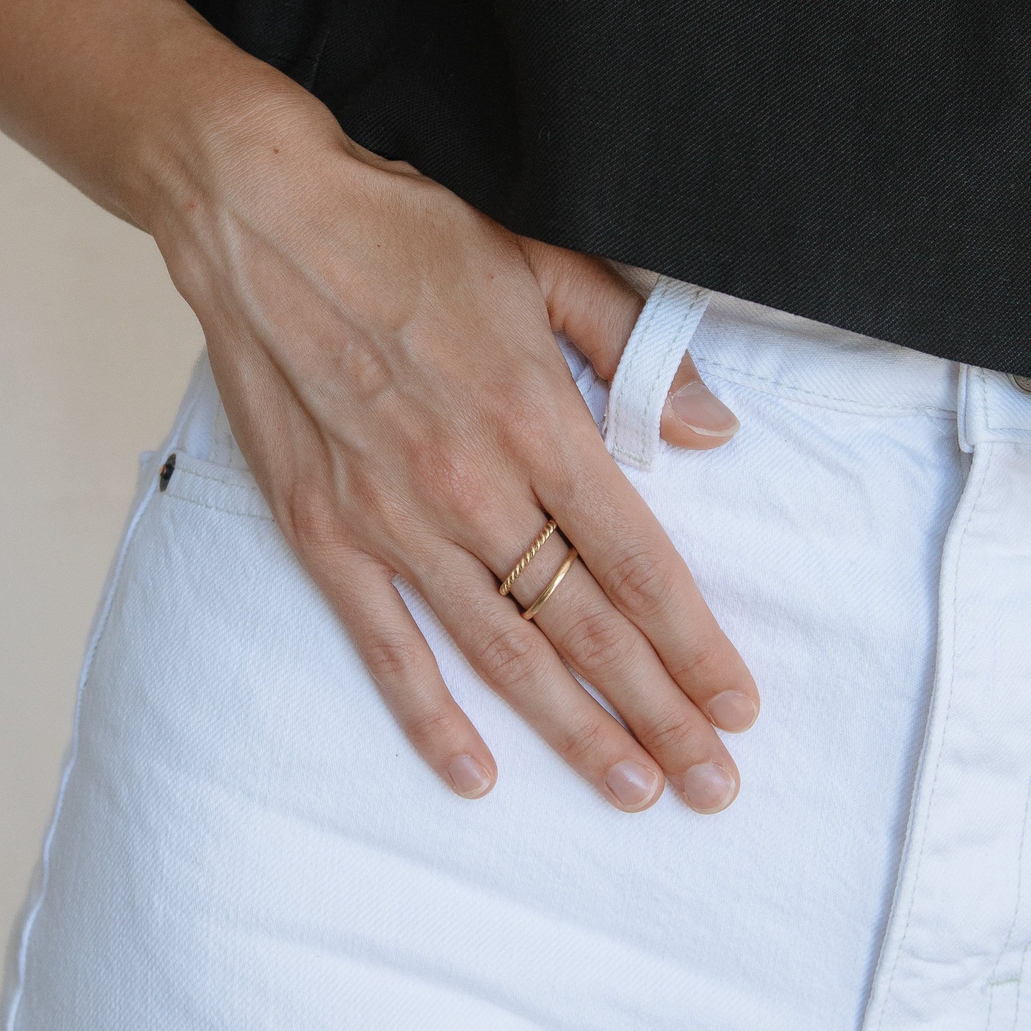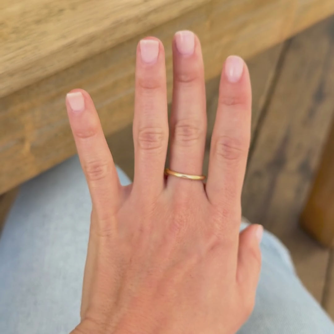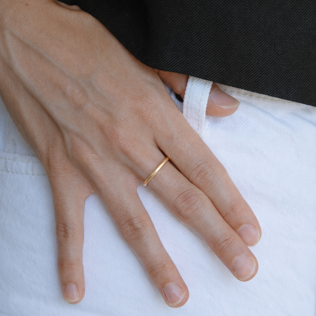 Un anillo esencial en oro de 18K, concebido como un básico atemporal. Con su silueta limpia y equilibrada, es perfecto para llevar solo o apilado con otras piezas. Esta es nuestra versión más gruesa; también disponible en versión más fina.