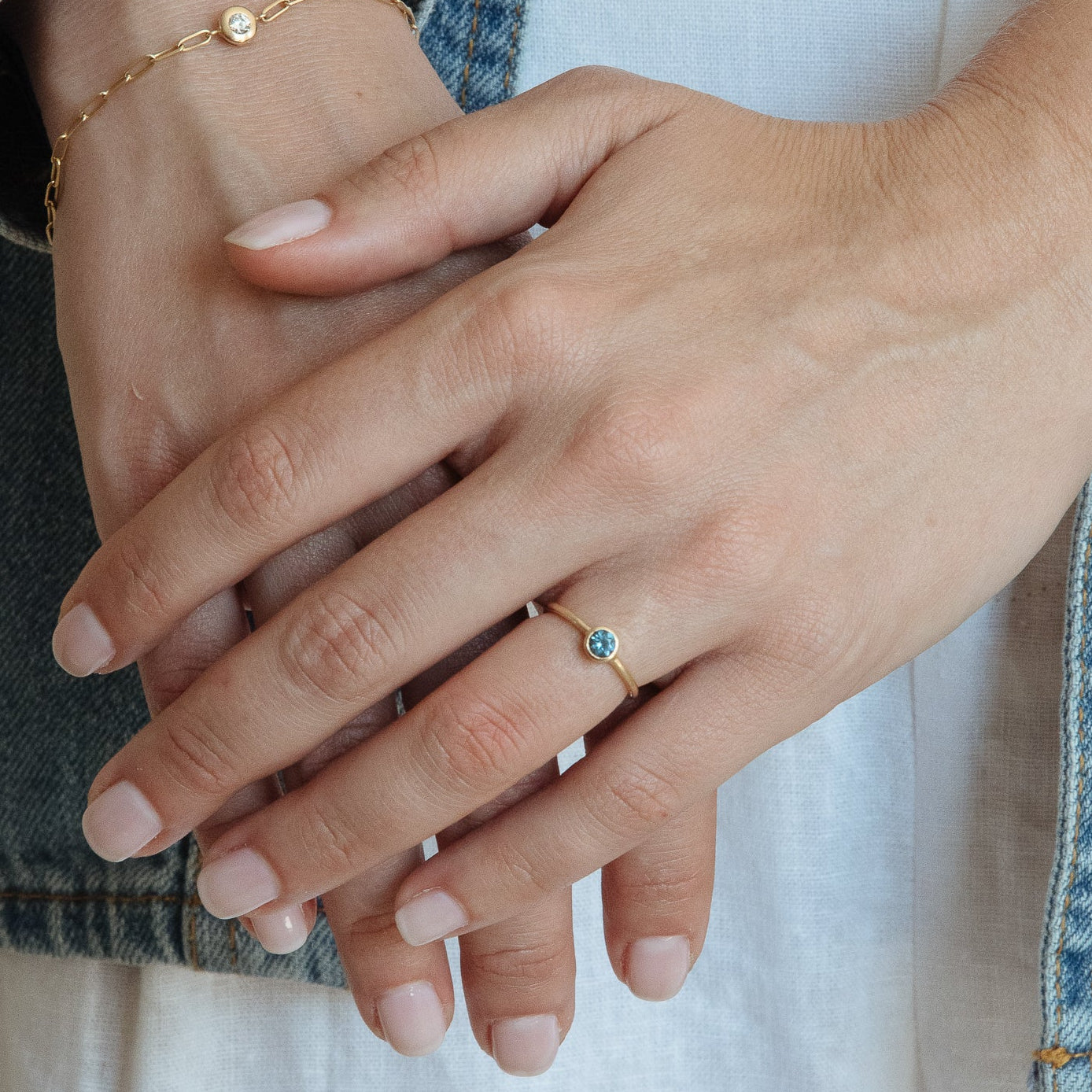 Anillo de oro de 18K con moissanitas engastadas en bisel, disponible en distintos colores. Cada piedra puede reflejar tu piedra de nacimiento, tu tono favorito o convertirse en un amuleto personal cargado de significado.