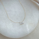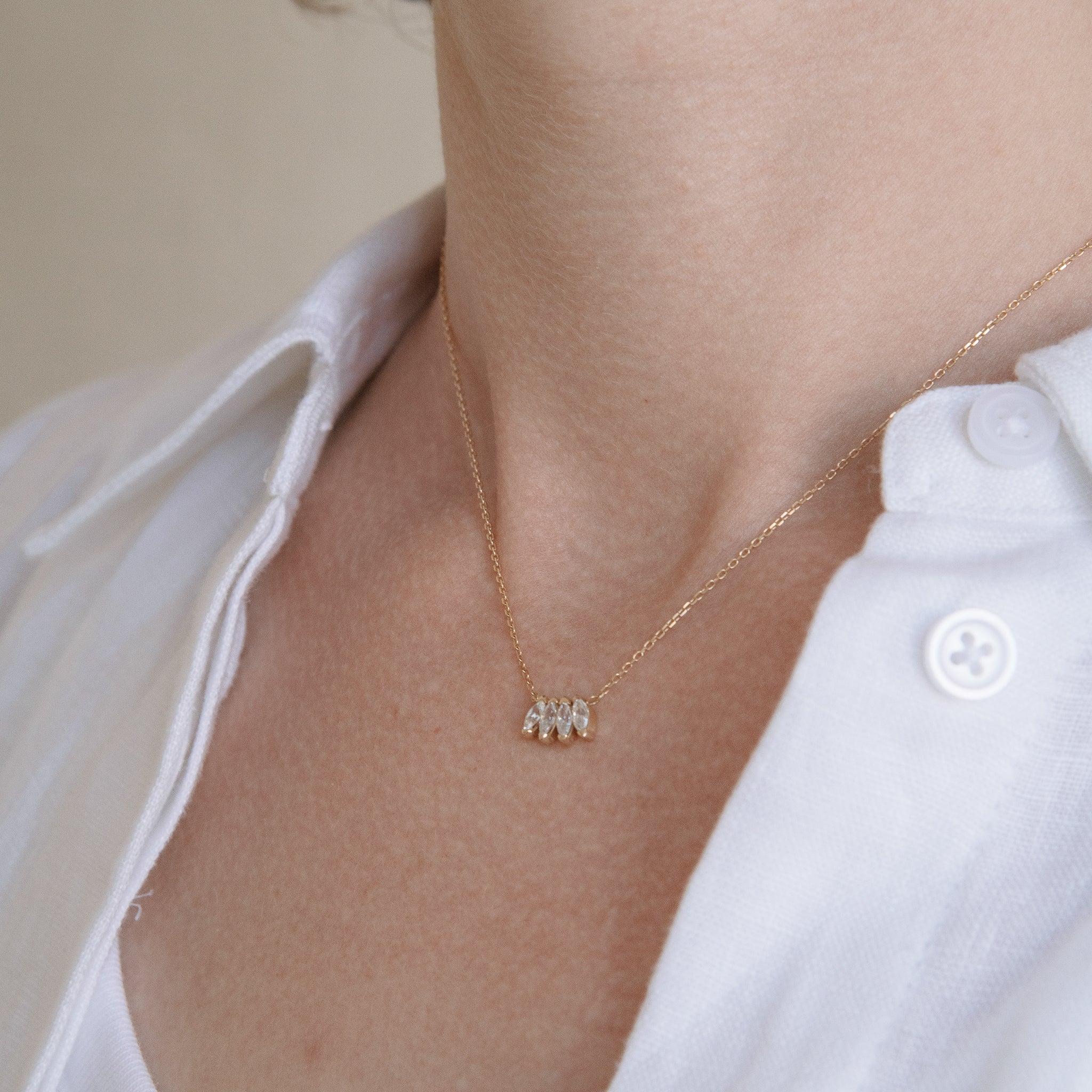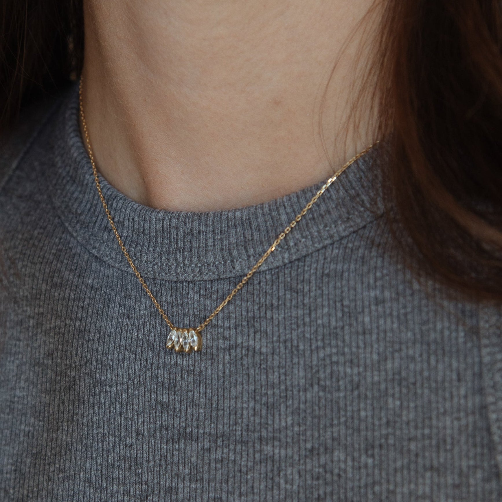 Cuatro piedras de corte marquesa, alineadas con precisión, forman el corazón de este diseño en oro de 18K. Su silueta limpia evoca conexión, armonía y refinamiento, con un brillo delicado que habla de fuerza sutil.