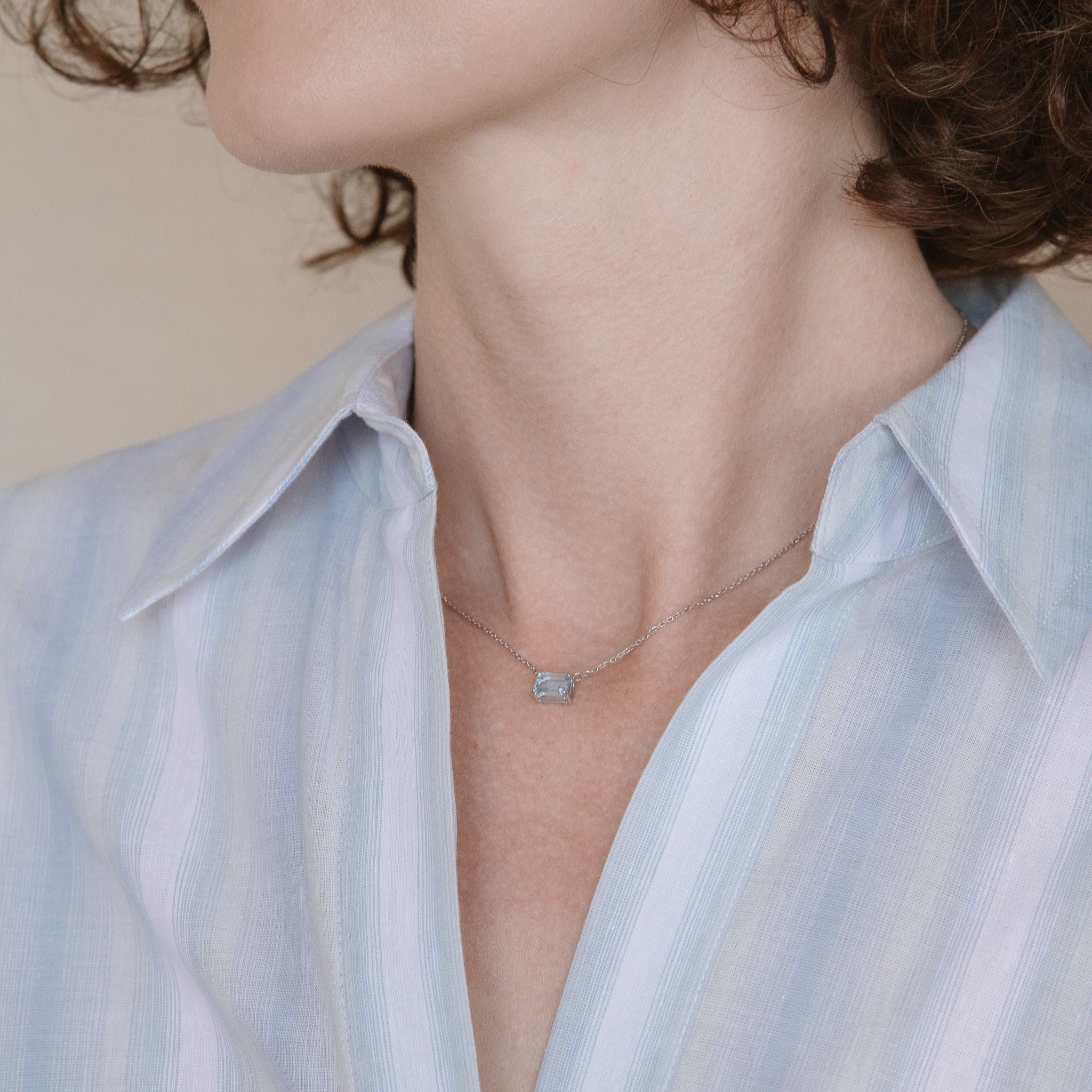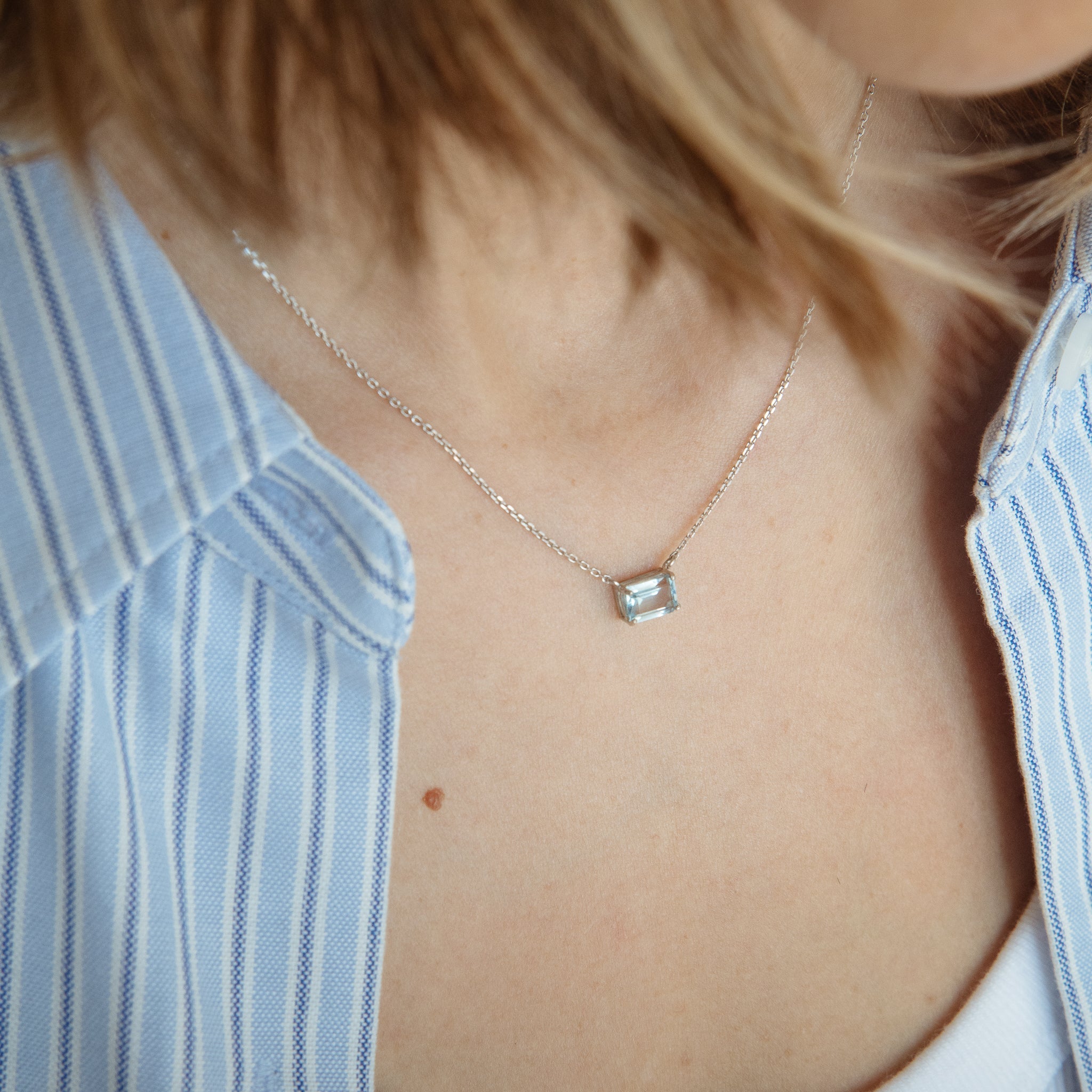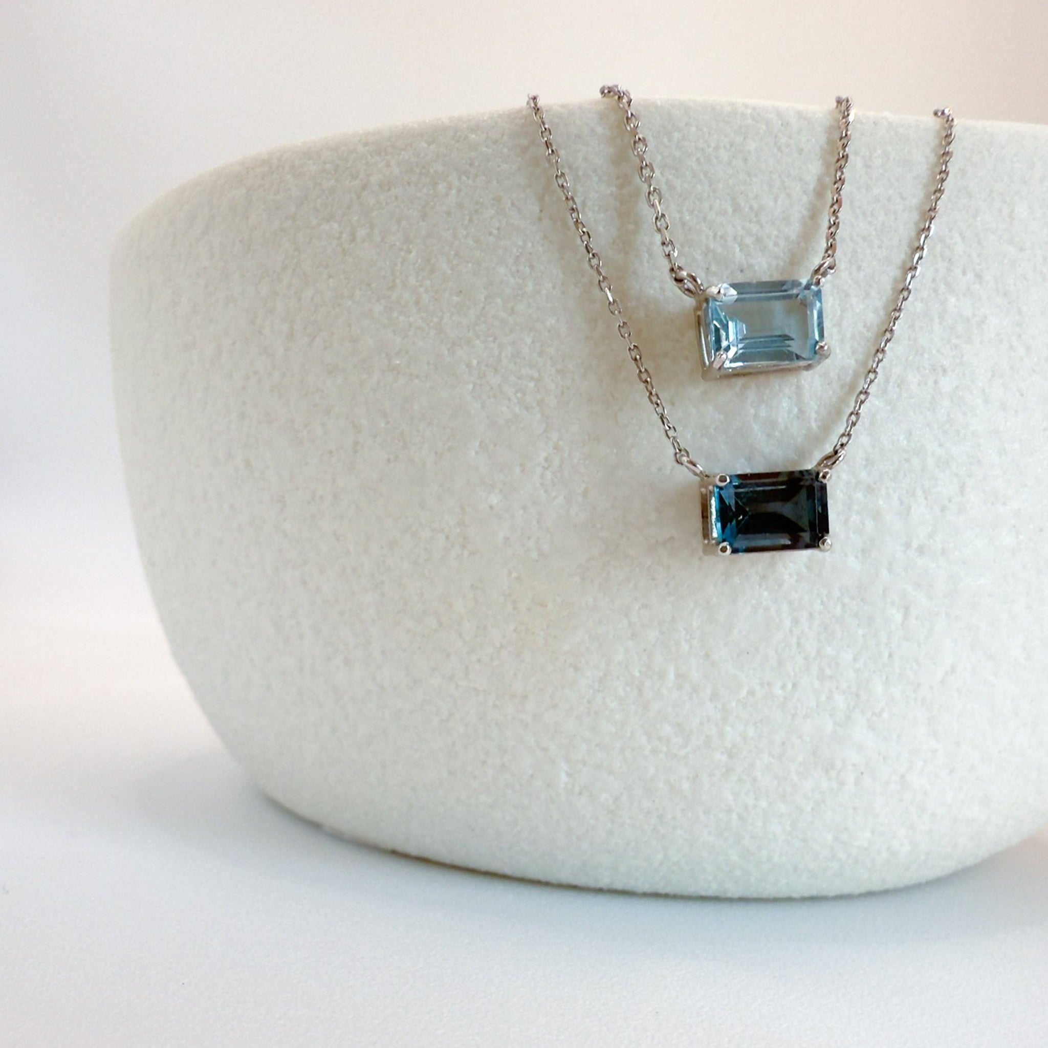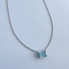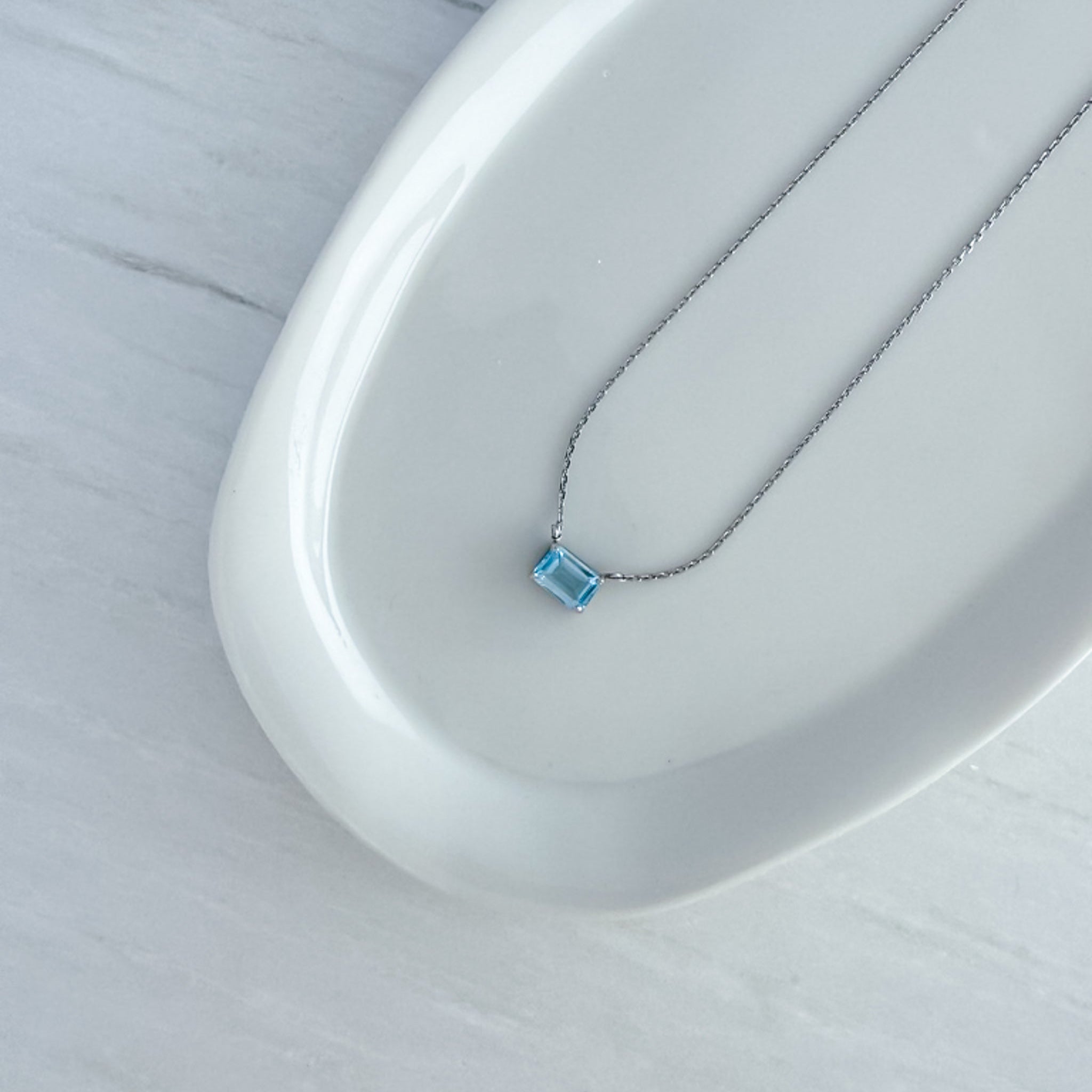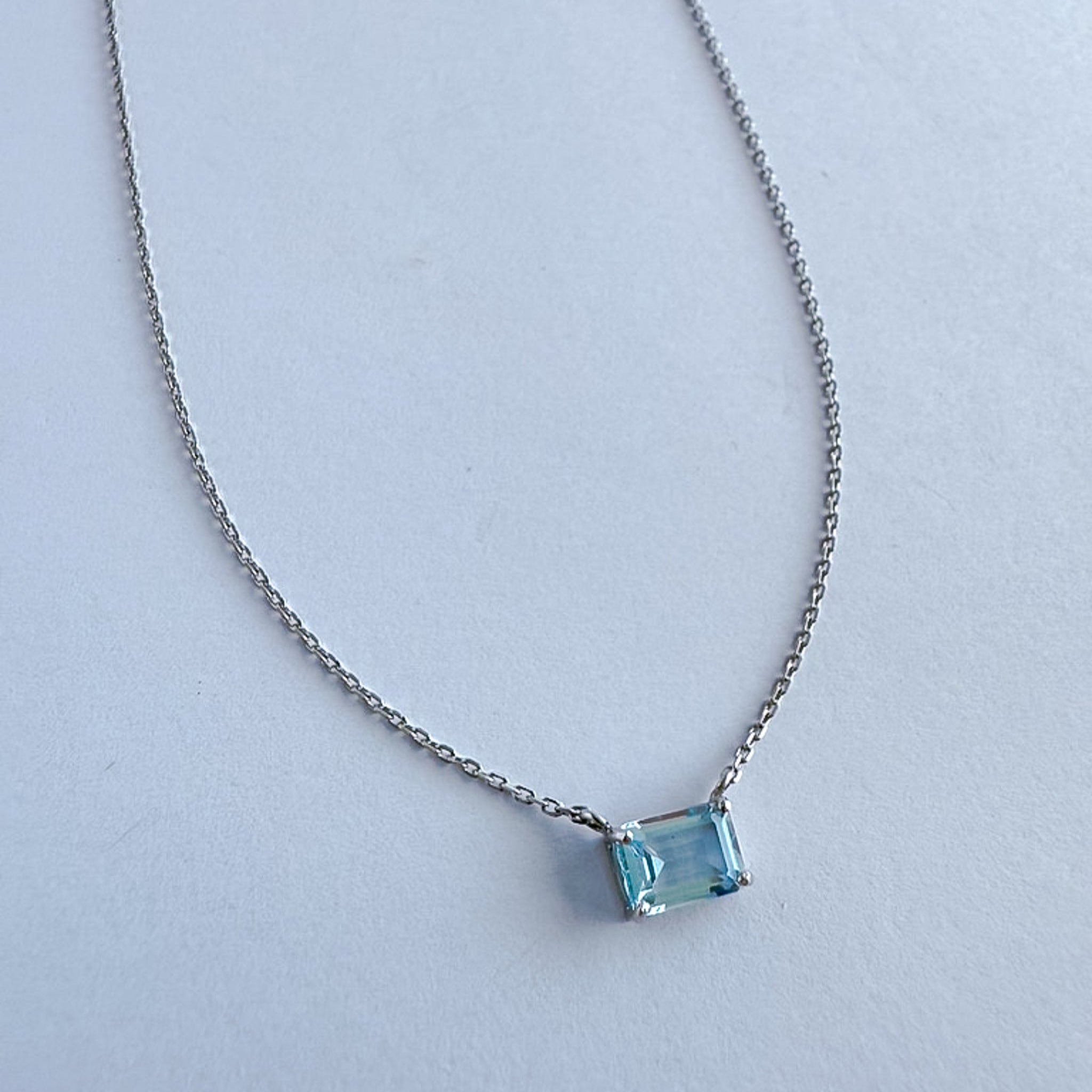Un topacio azul cielo de corte esmeralda ilumina el oro blanco de 18K con un resplandor sereno. Una joya luminosa que se convierte en amuleto de calma y luz, pensada para acompañarte siempre.