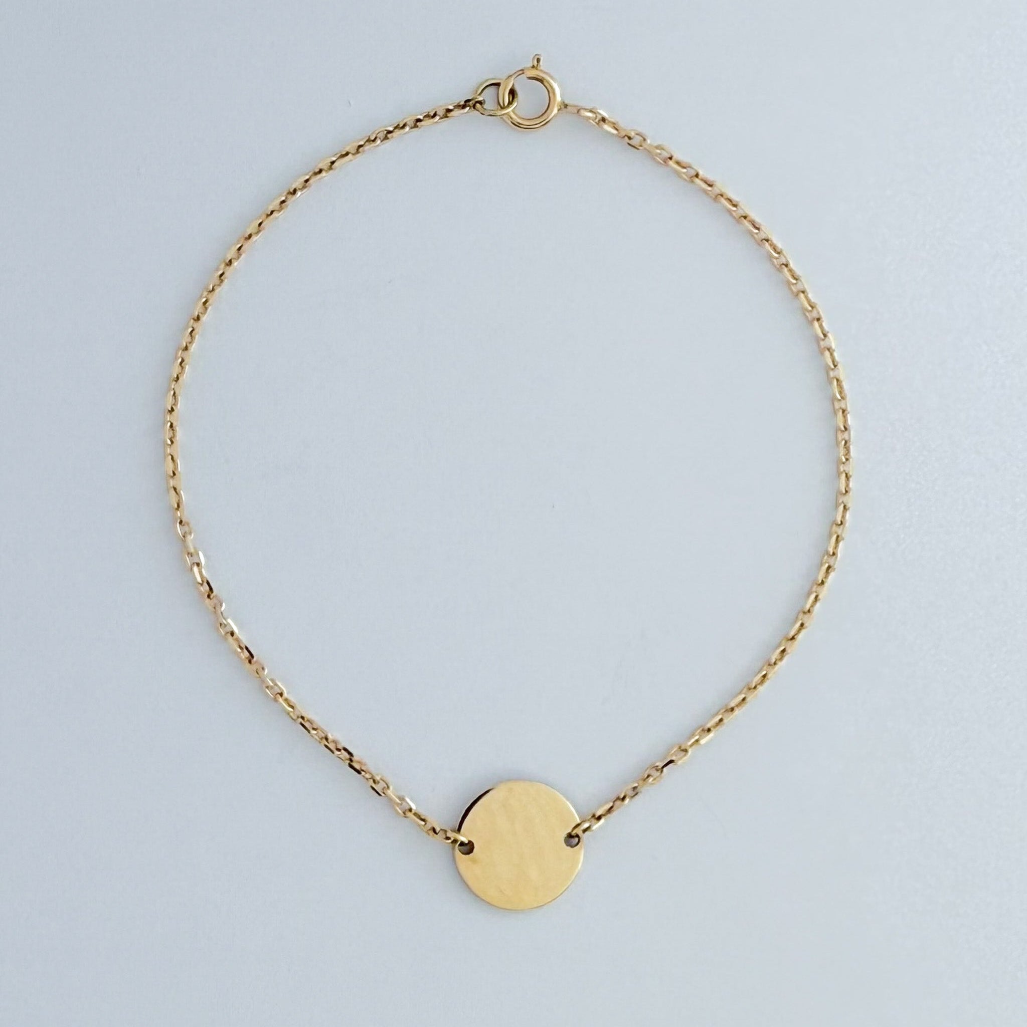 Un círculo de oro enlazado a una cadena delicada. Sutil y elegante, perfecta sola o personalizada con un grabado. Combina con nuestras pulseras de diamantes para un look equilibrado y sofisticado.