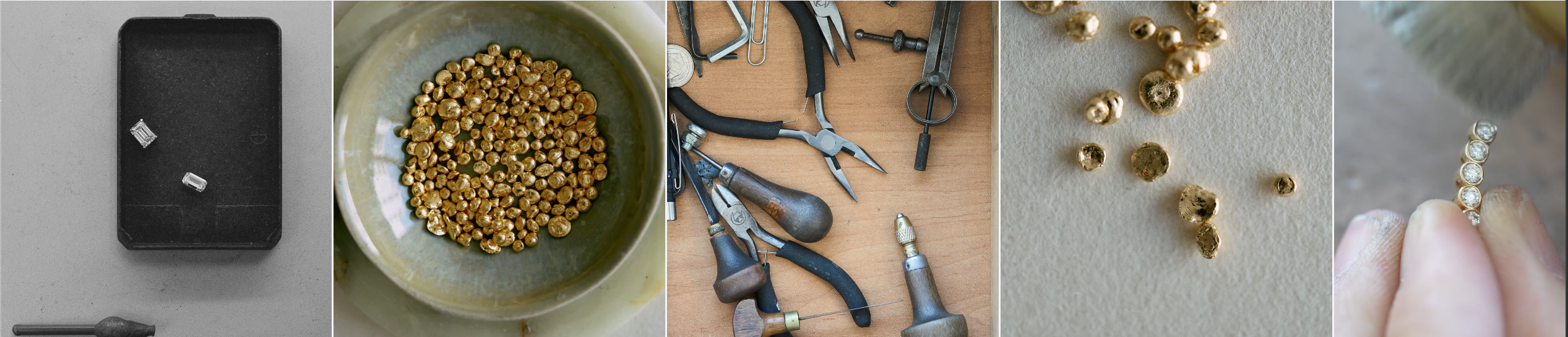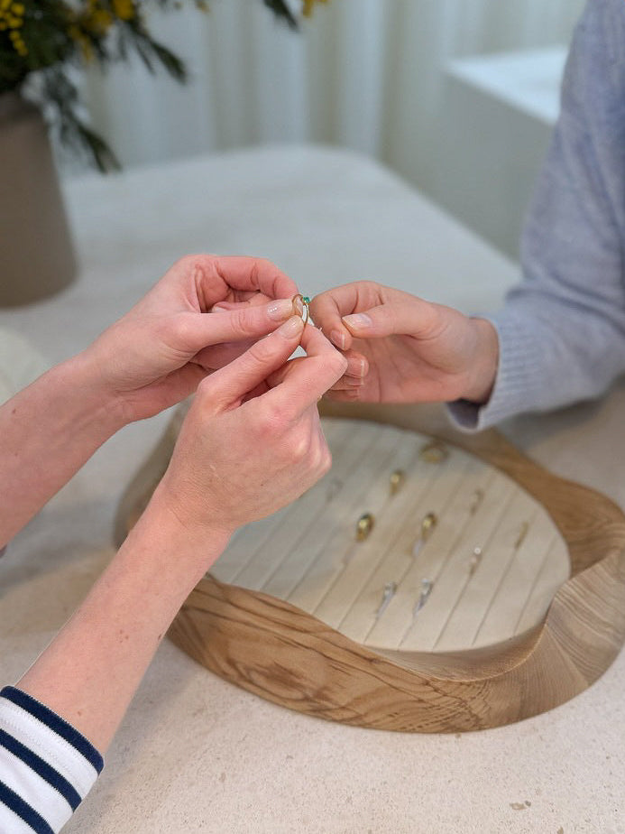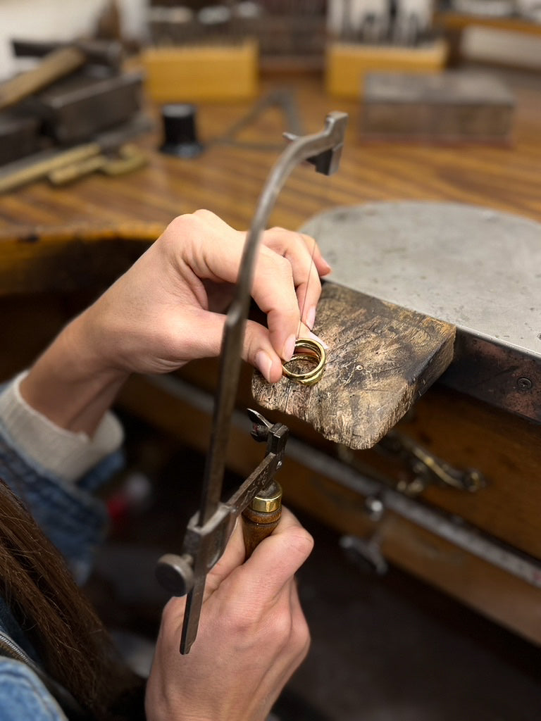 En nuestro taller de Barcelona damos vida al diseño de manera artesanal. Trabajamos con oro reciclado de 18K y piedras responsables, cuidando cada gesto para que la pieza sea única.